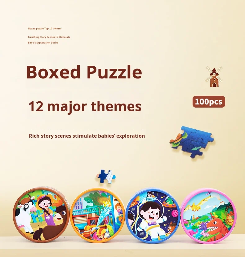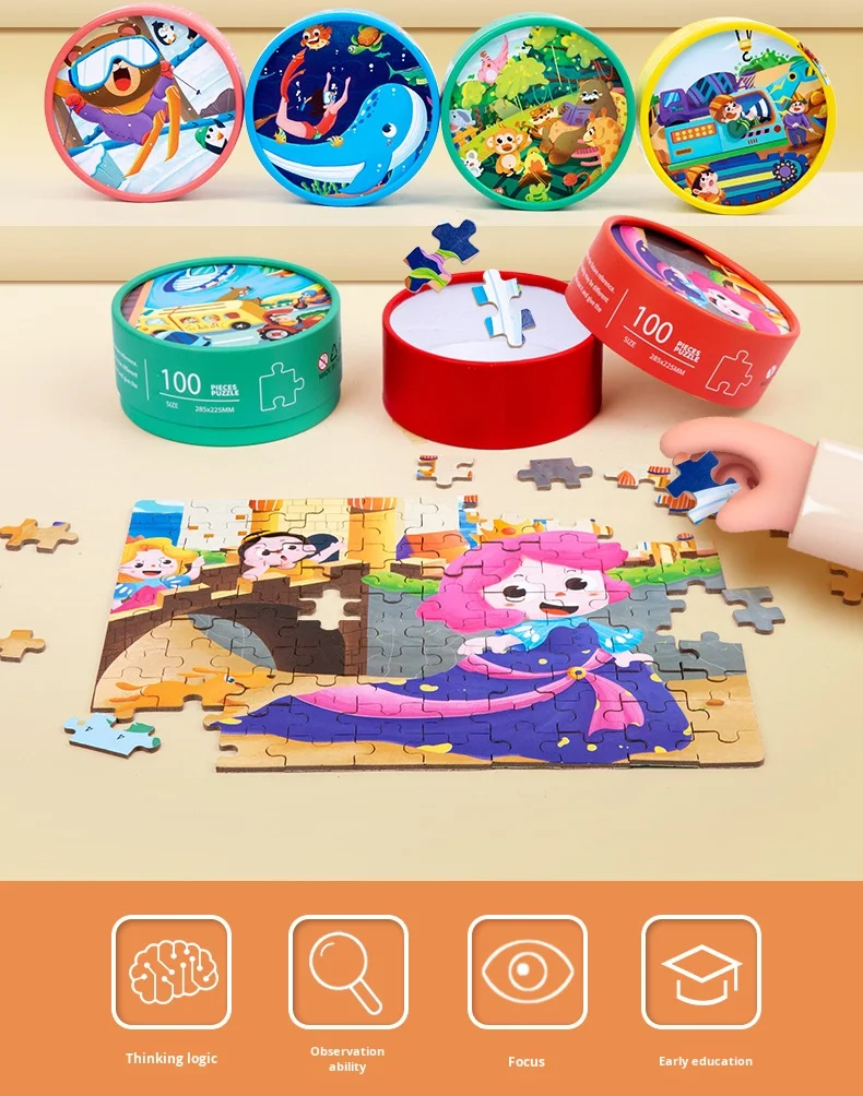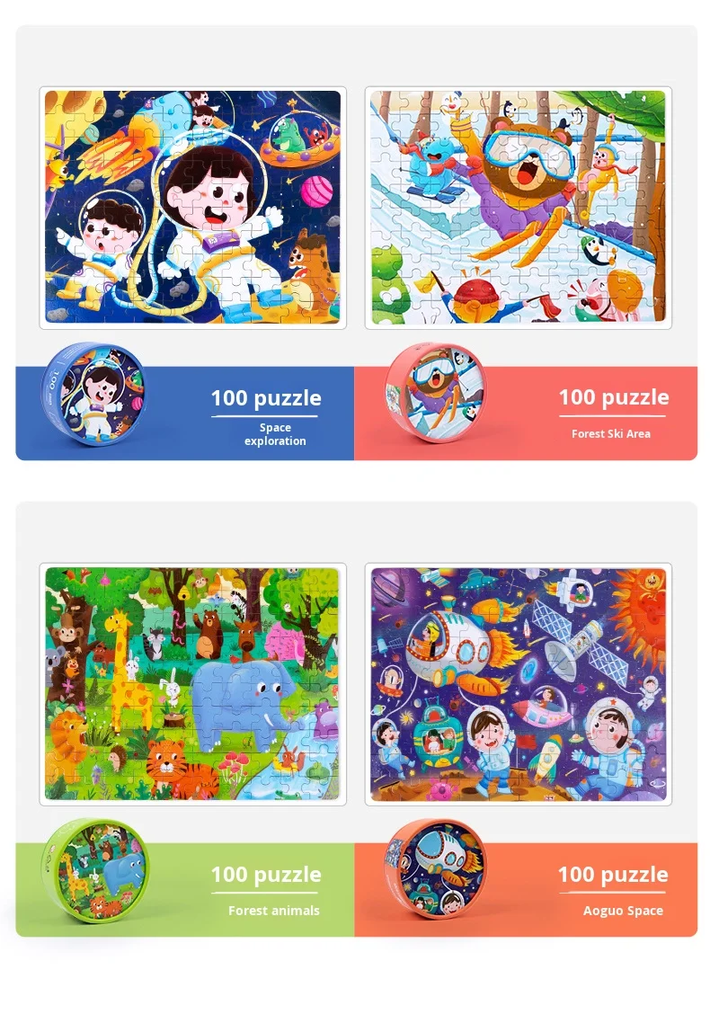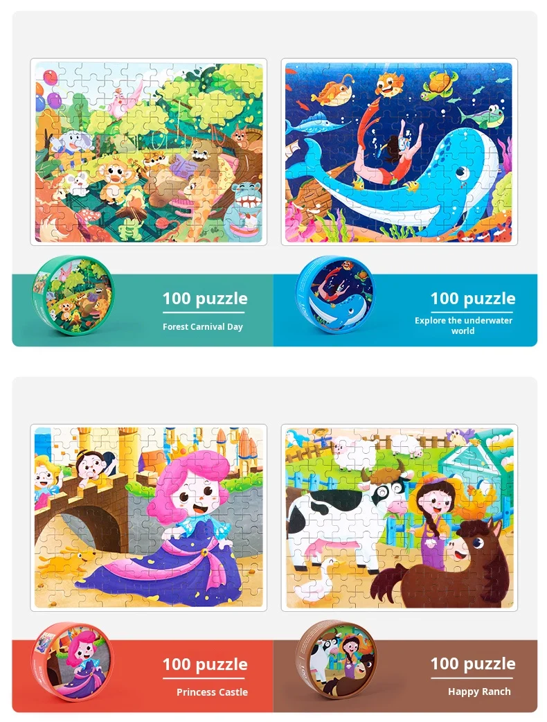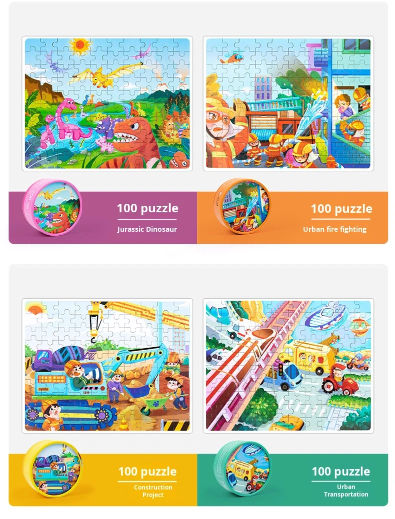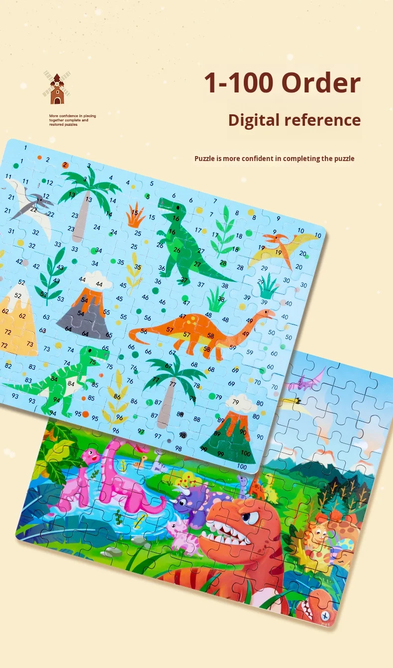 100-Piece Wooden Animal Flat Puzzle Dinosaur Cartoon Early Education Toy Box Gift for Kids’ Kindergarten