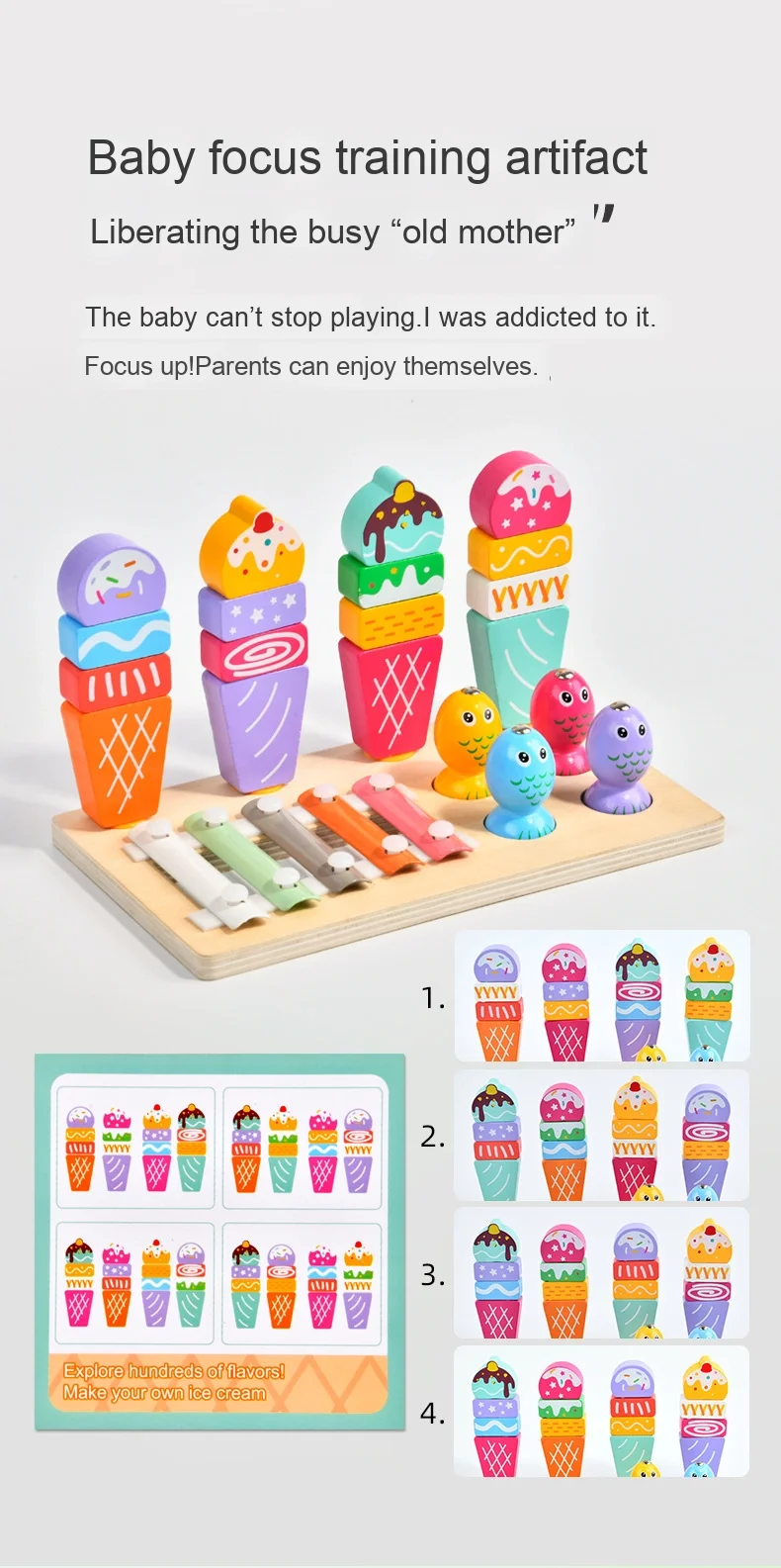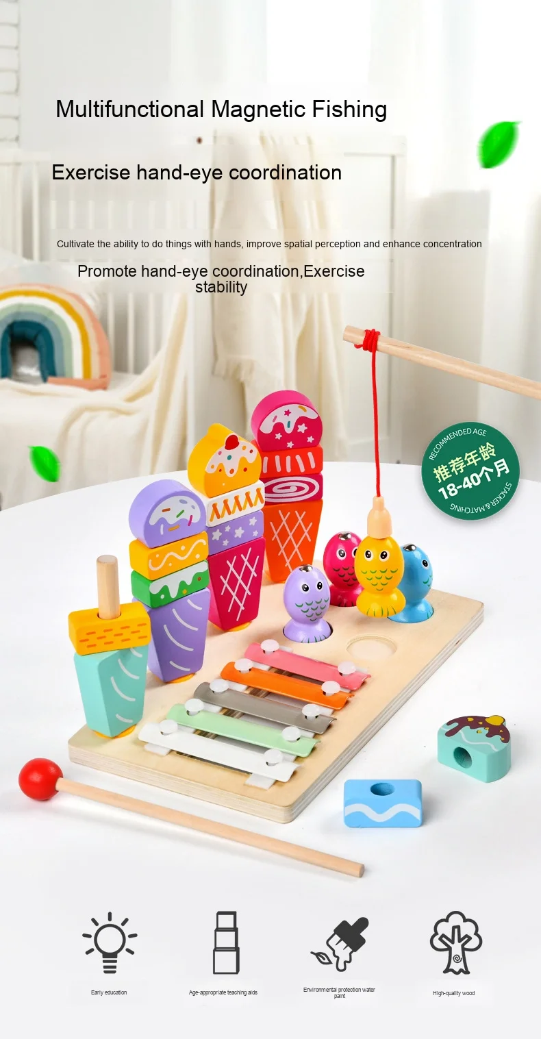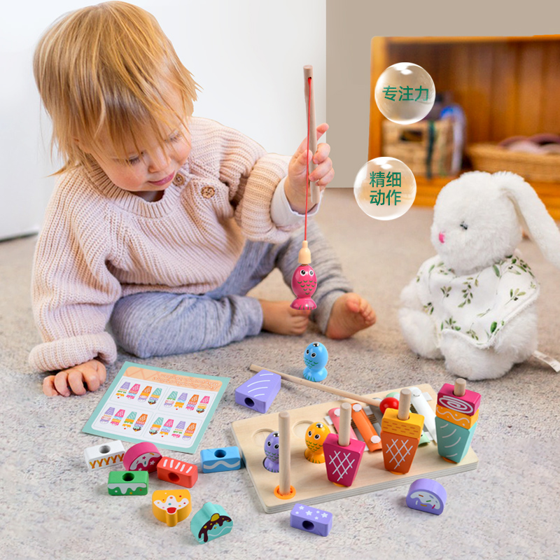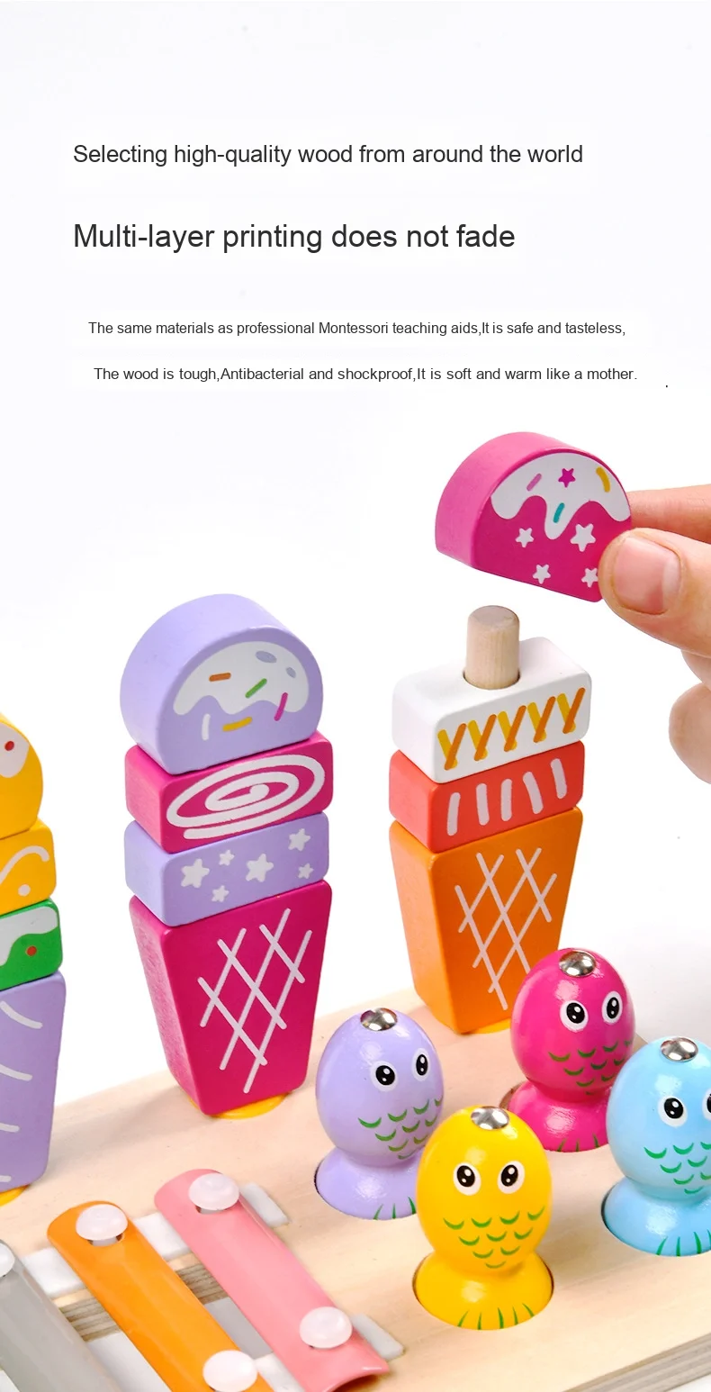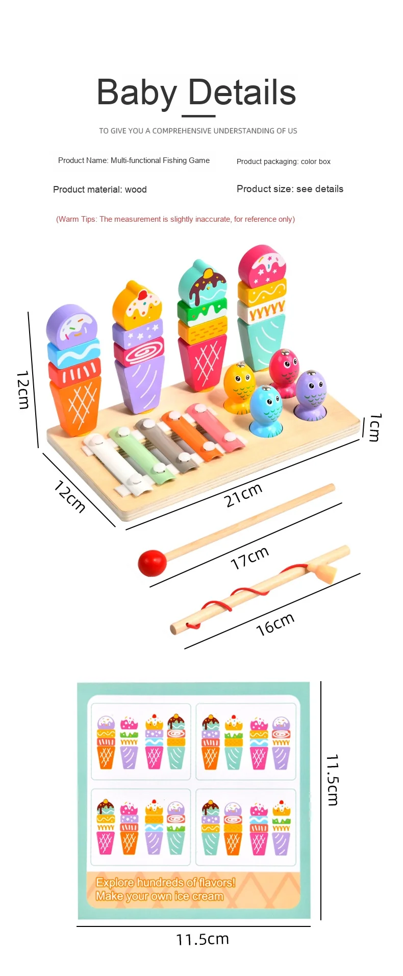 Children’s Early Education Multifunctional Wooden Toy 3-in-1 Ice Cream Fishing Game Math Subject for Ages 2-4 Years