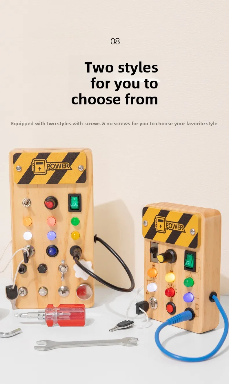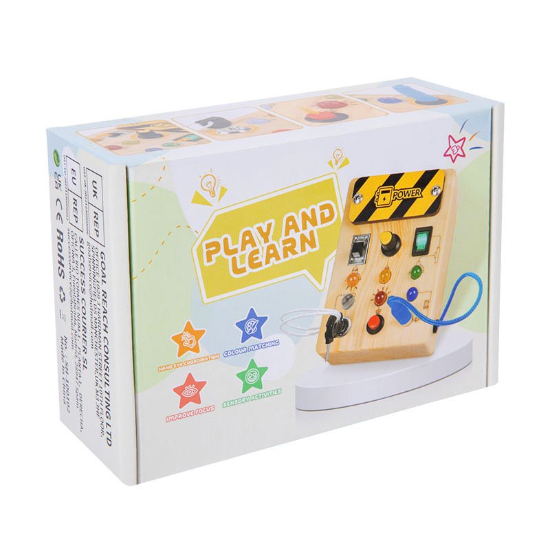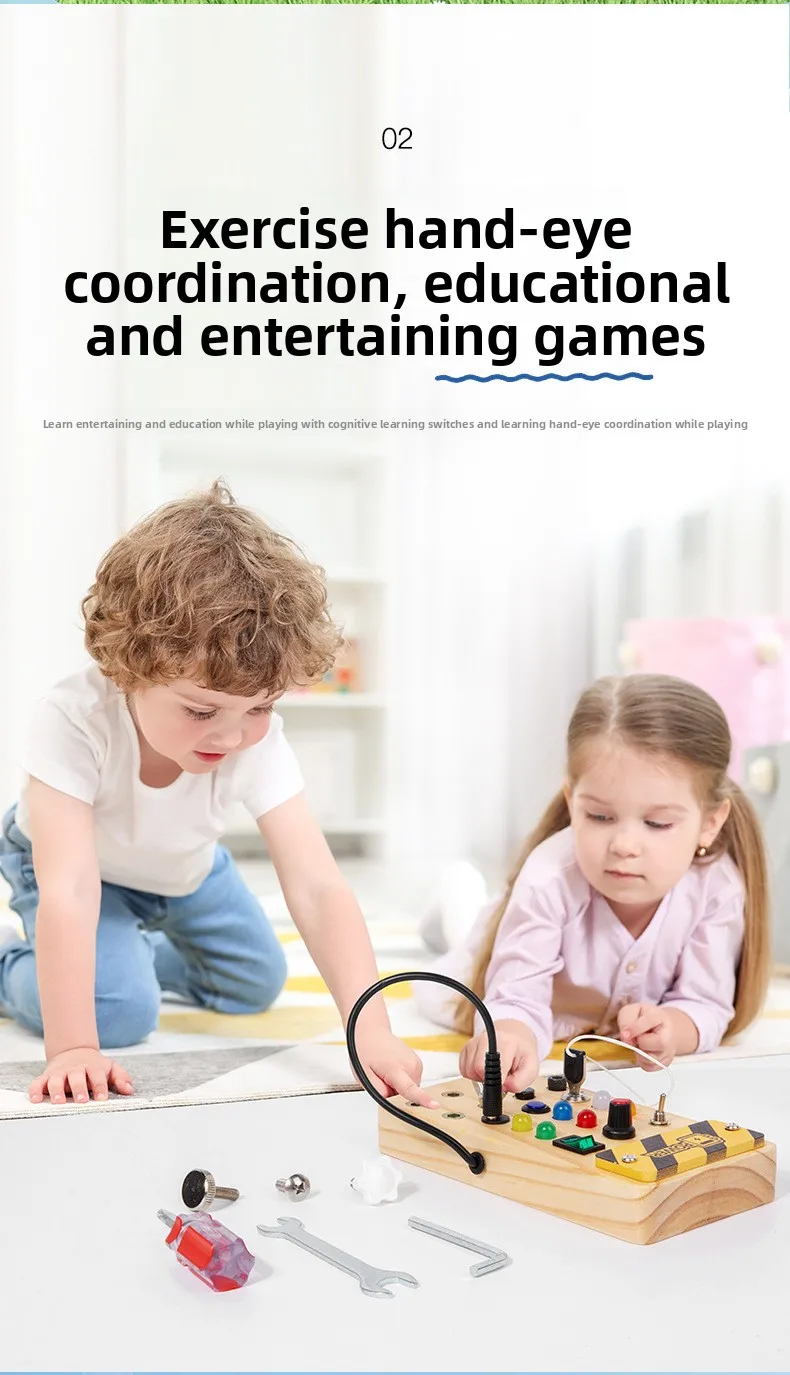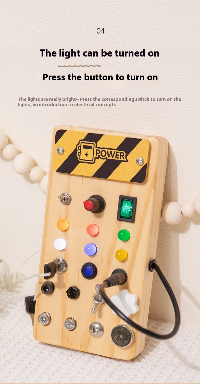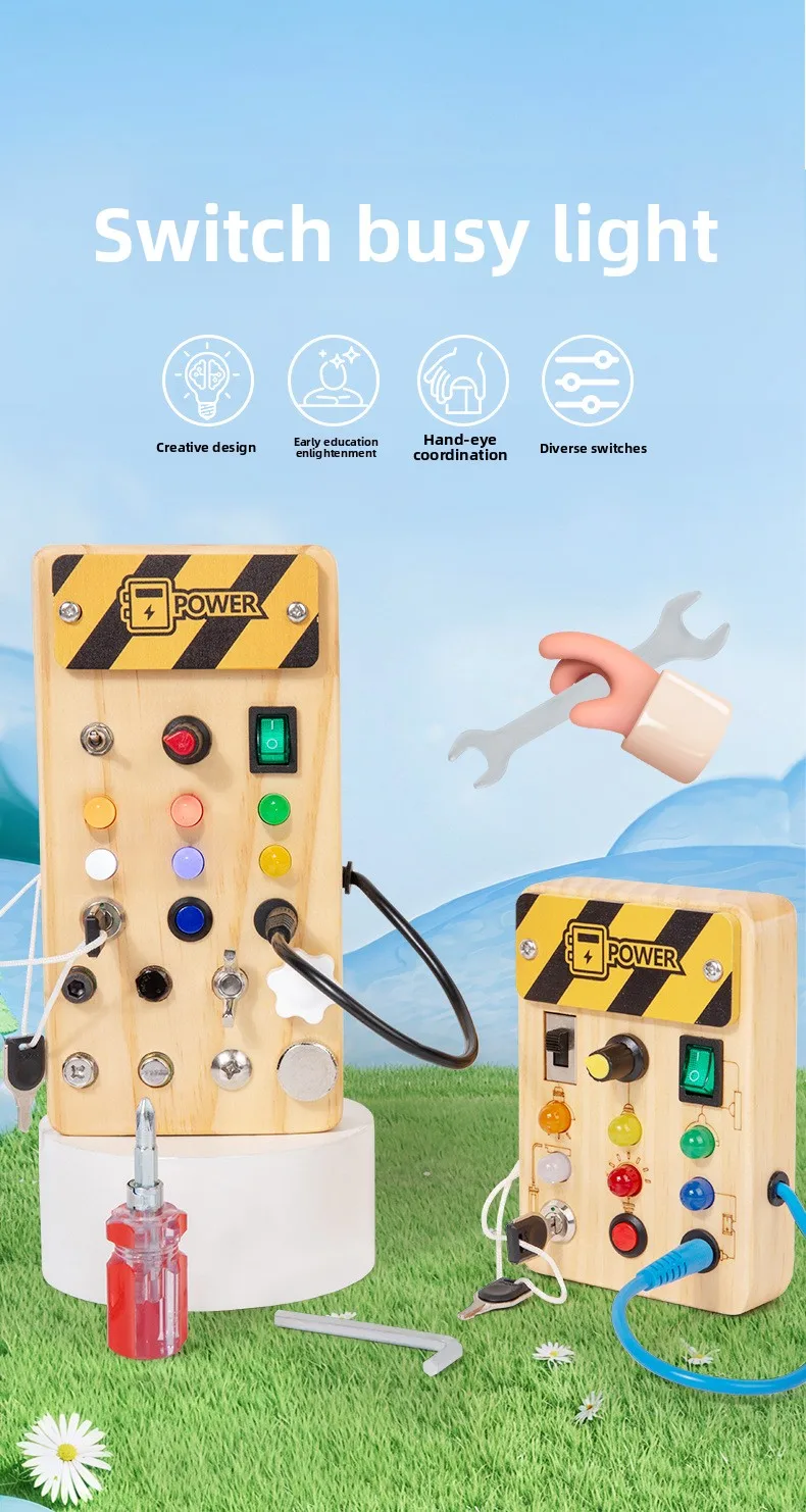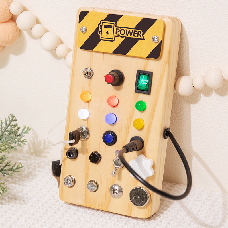 Children’s Educational Busy Board LED Switch Toy Montessori Circuit Board Design Handmade Wooden Toy