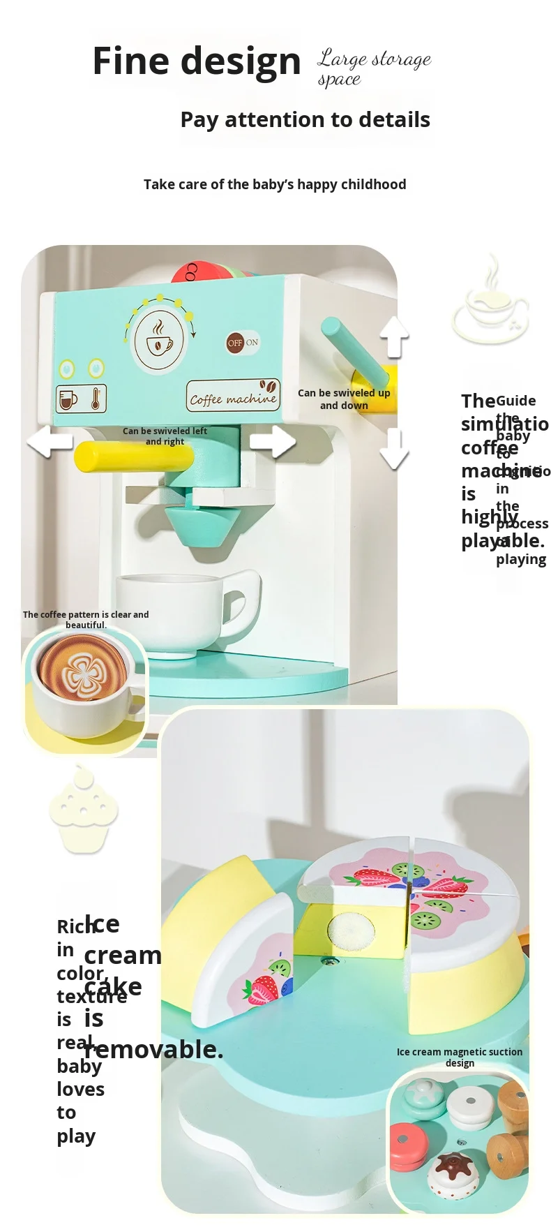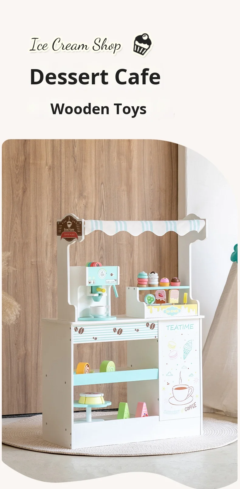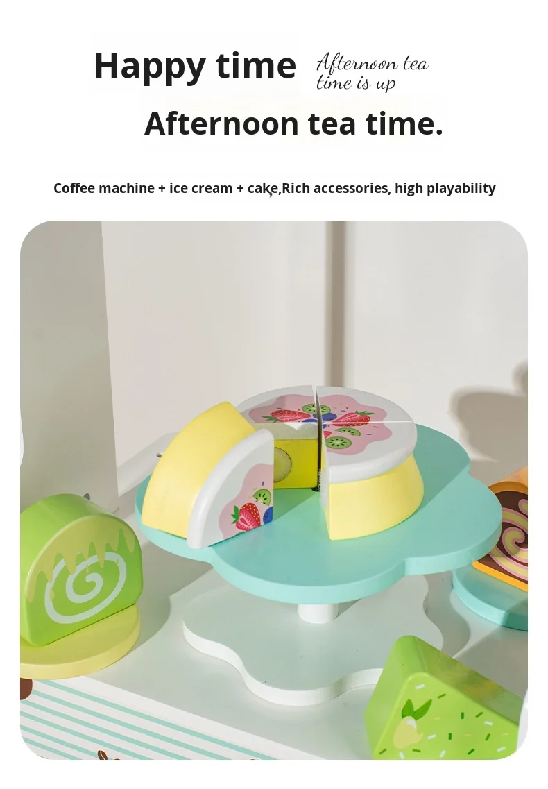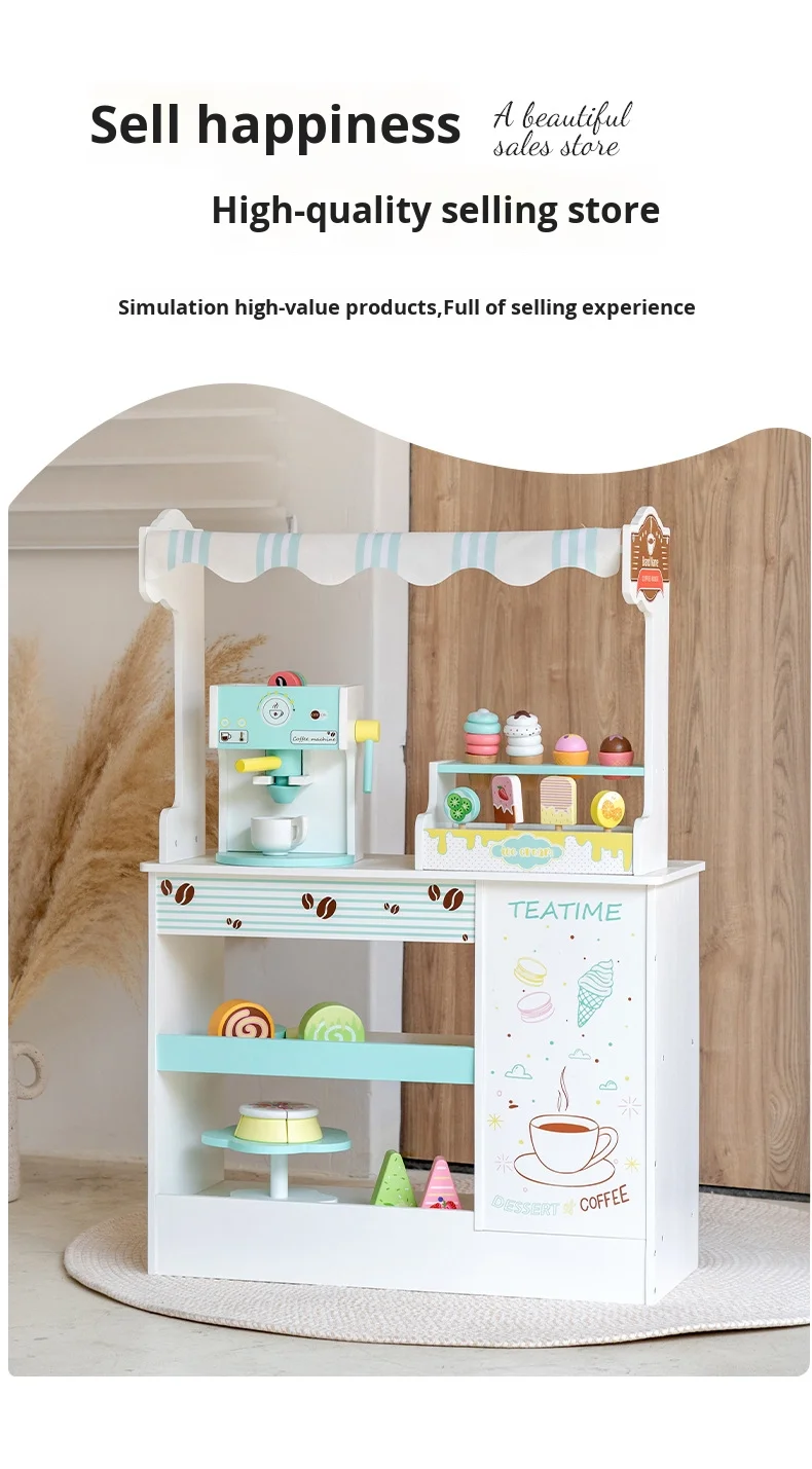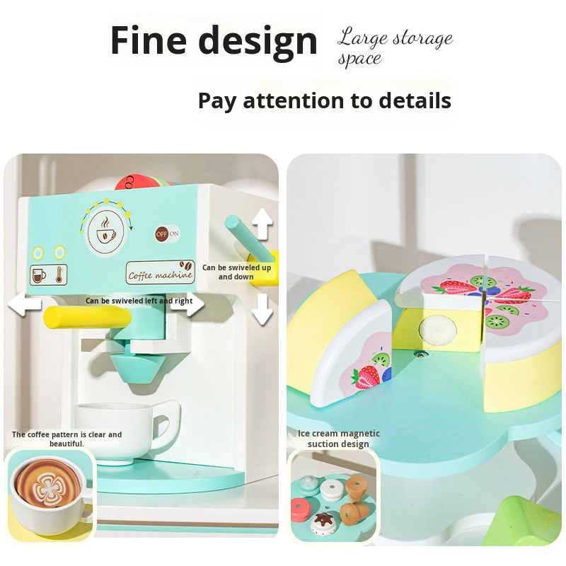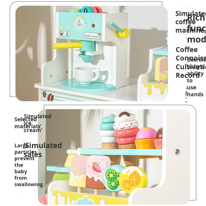 Children’s Educational Kitchen Set Wooden Toys Play House Simulation Coffee Machine Ice Cream Dessert Stall Box Packed for Kids