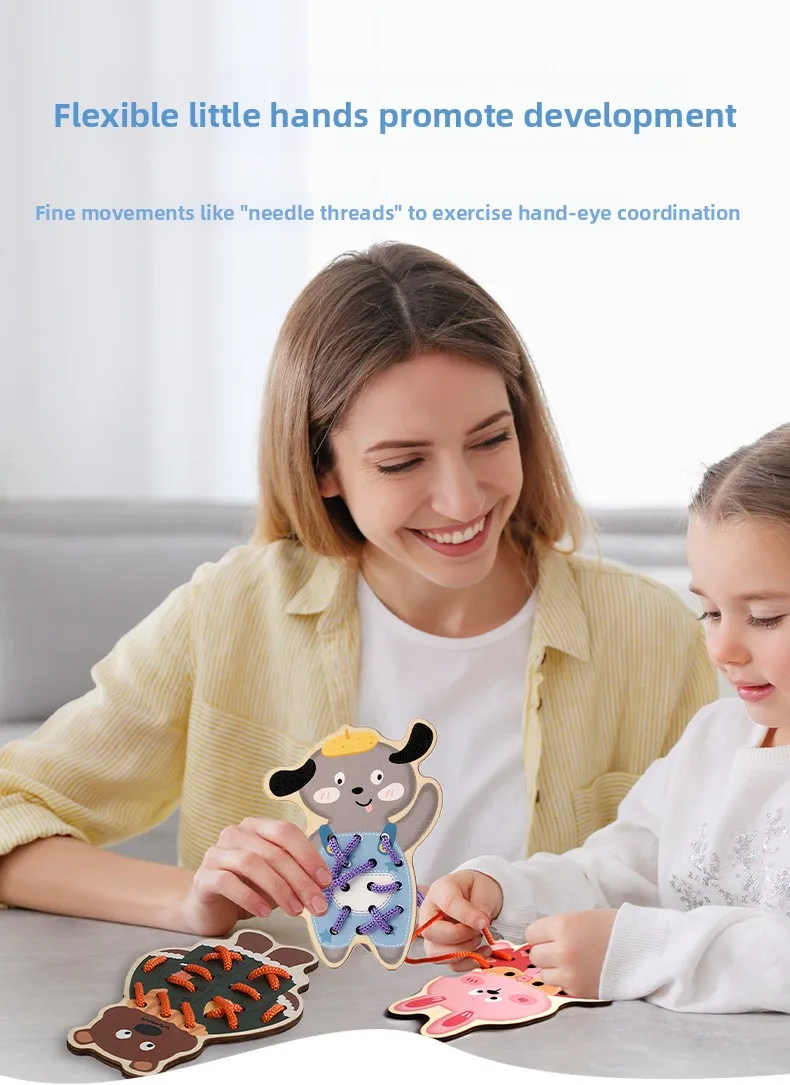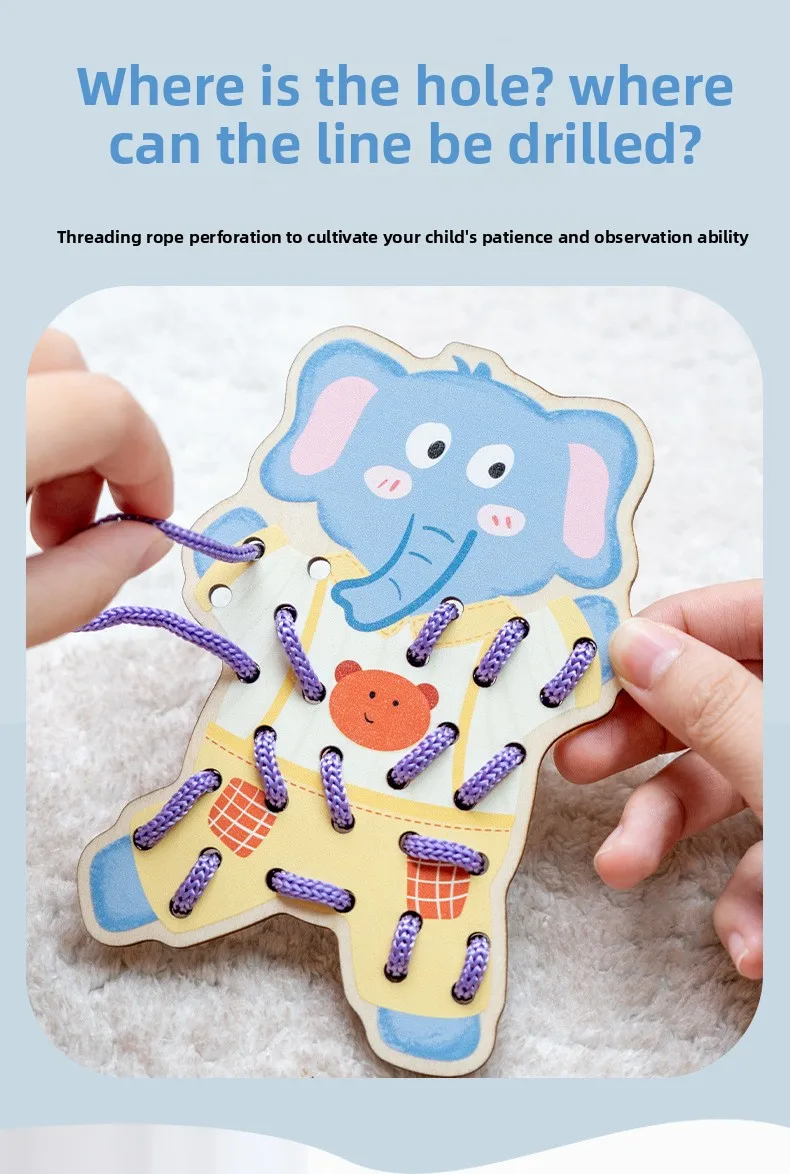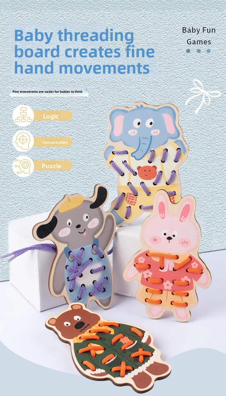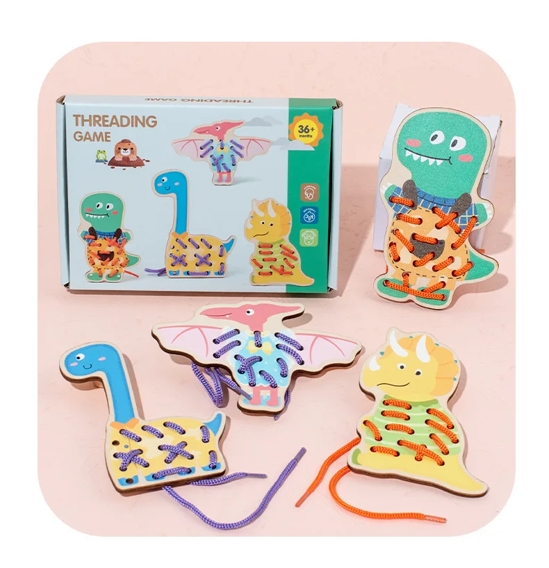 Children’s Educational Wooden Toy Cross-Border Dinosaur Rope Game for Early Hand-Eye Coordination Exercise for Babies