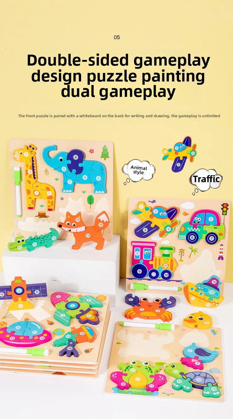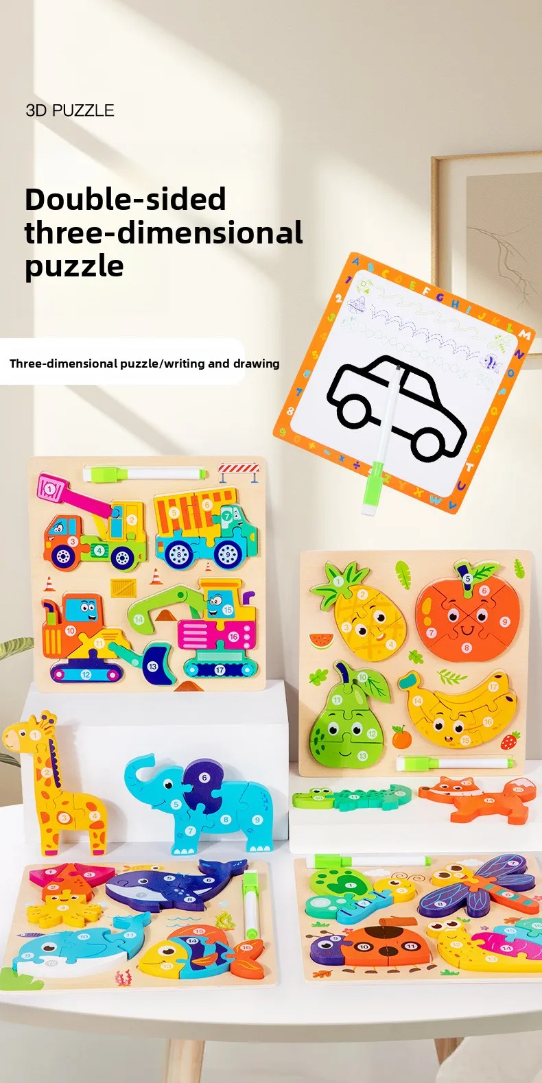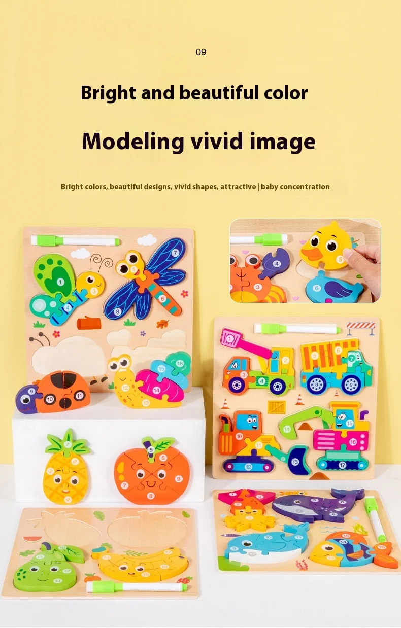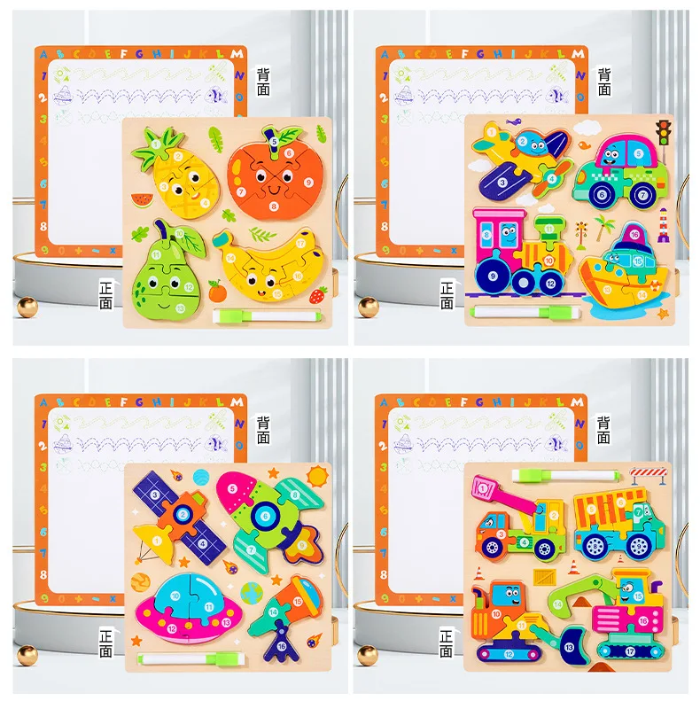 Children’s Wooden Educational Early 4-in-1 Stereo Matching Drawing Board Cognitive Cartoon Toy Puzzle for Baby Learning