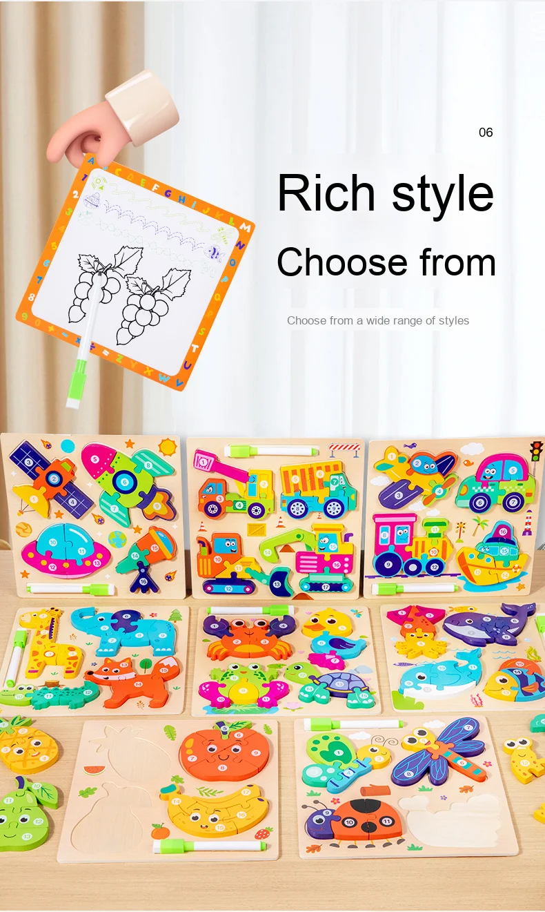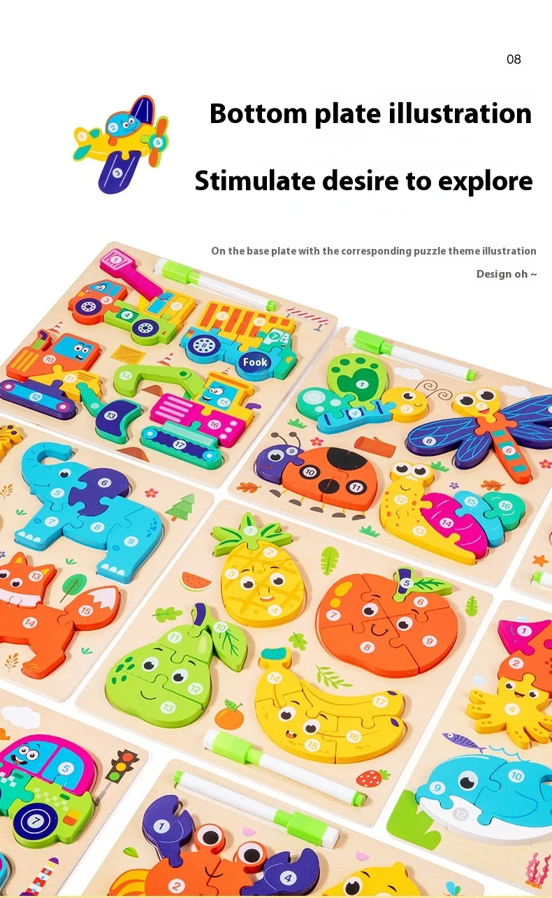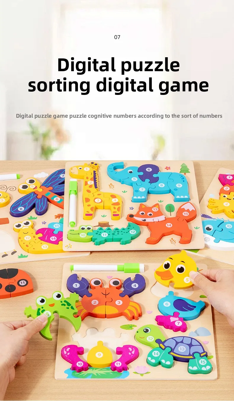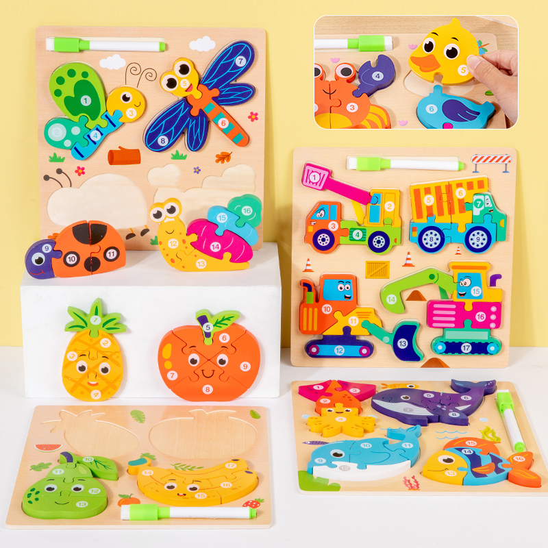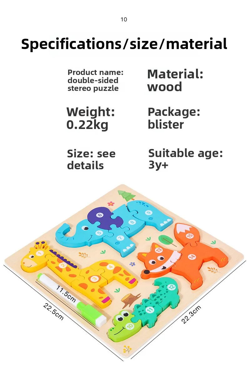 Children’s Wooden Educational Early 4-in-1 Stereo Matching Drawing Board Cognitive Cartoon Toy Puzzle for Baby Learning