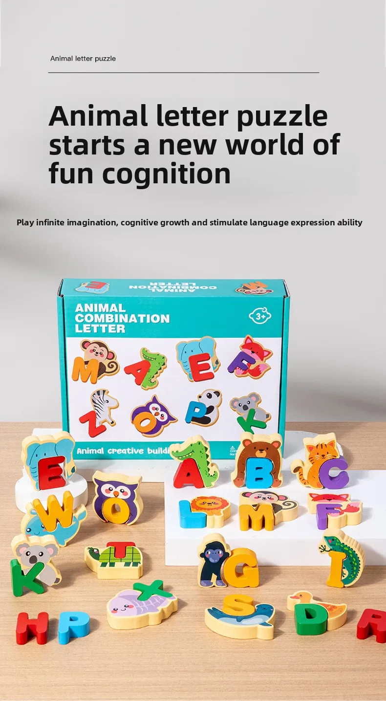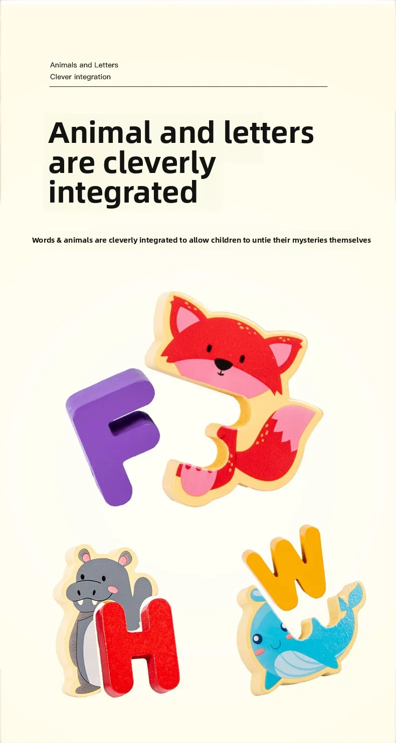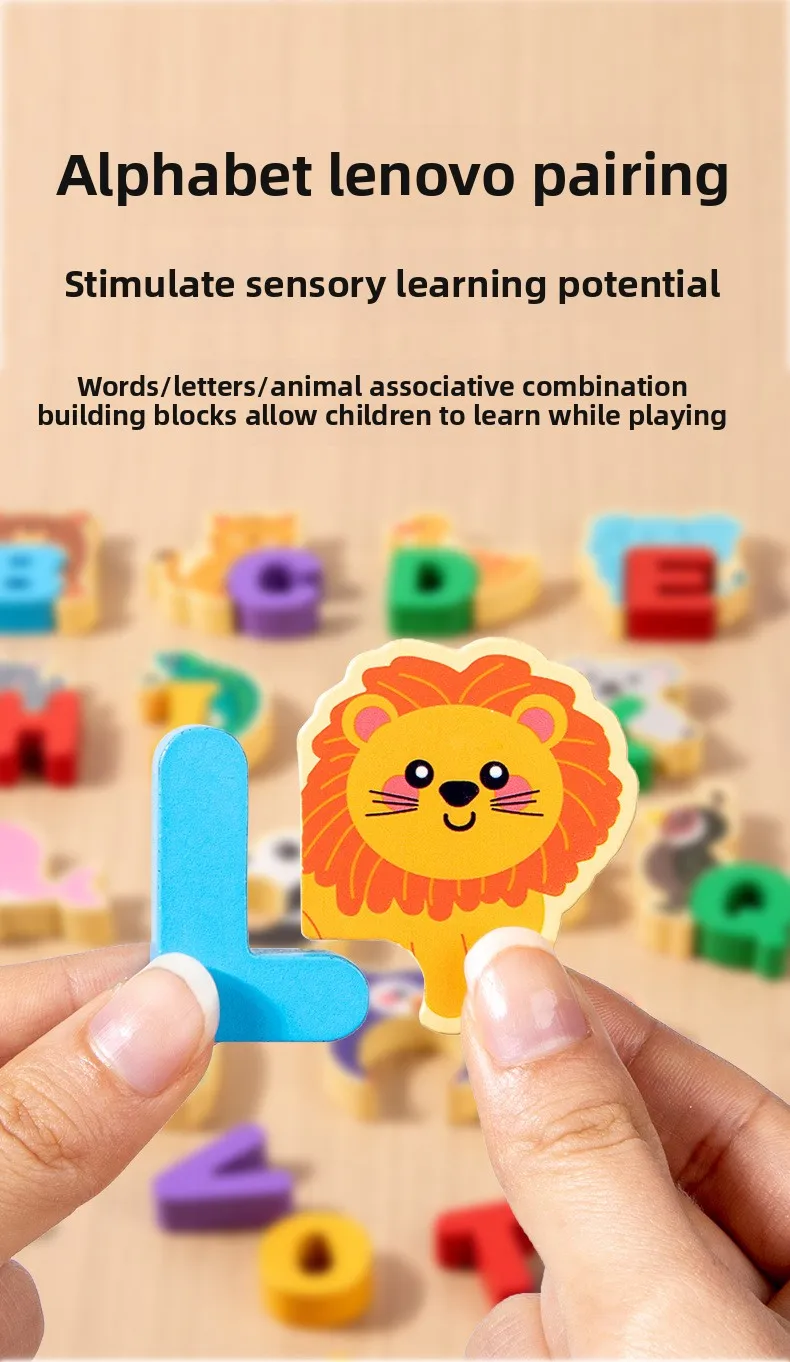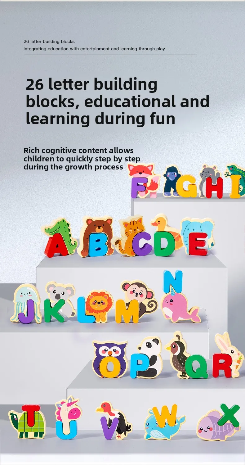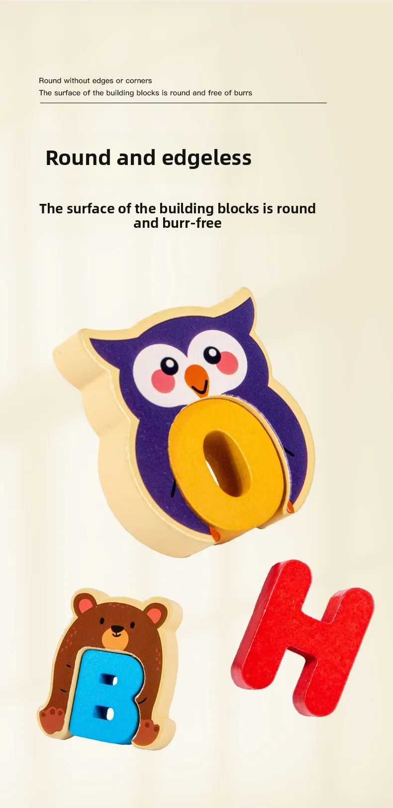 Double-Sided 3D Wooden English Animal Blocks New Early Education Number Letter Matching Puzzle Children’s Educational Toy