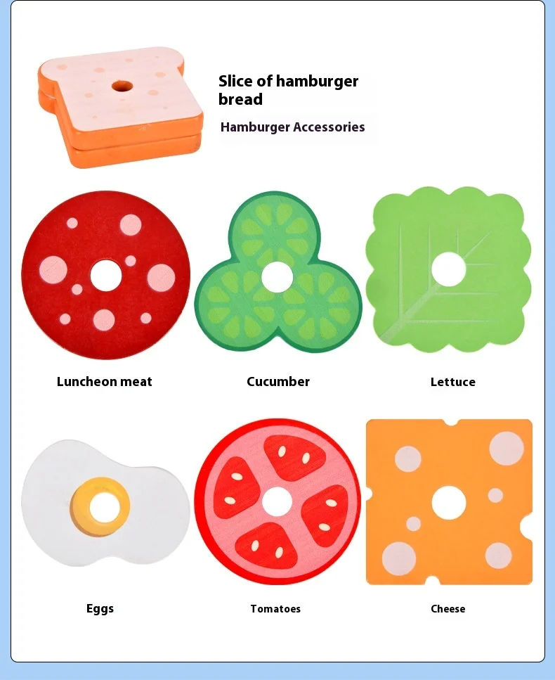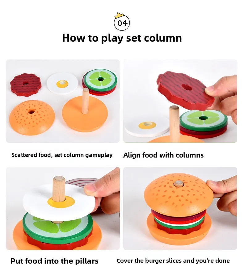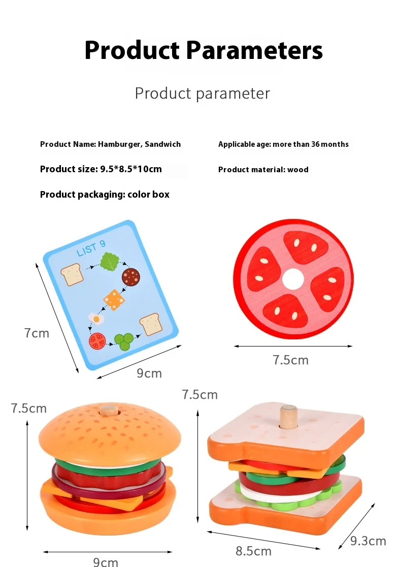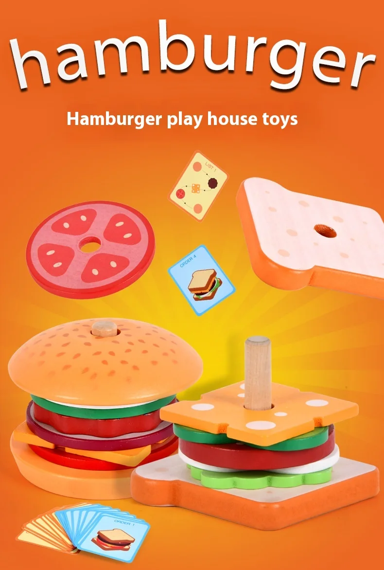 Early Education Unisex Wooden Simulation Hamburger Sandwich Stacking Blocks Kids’ Kitchen Play House with Educational Toys