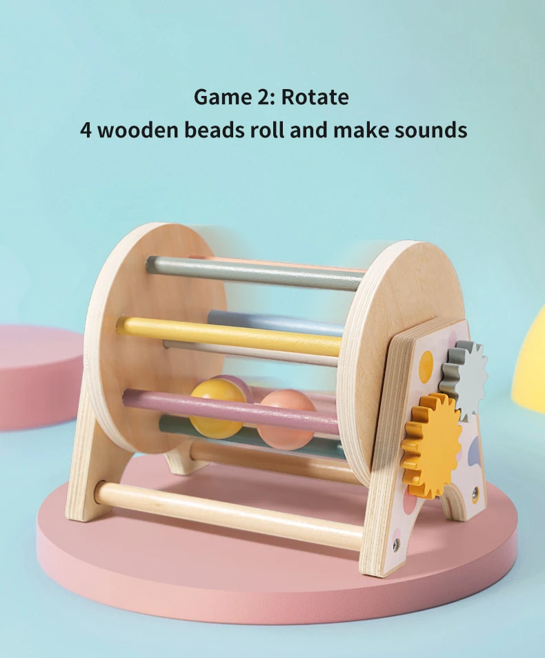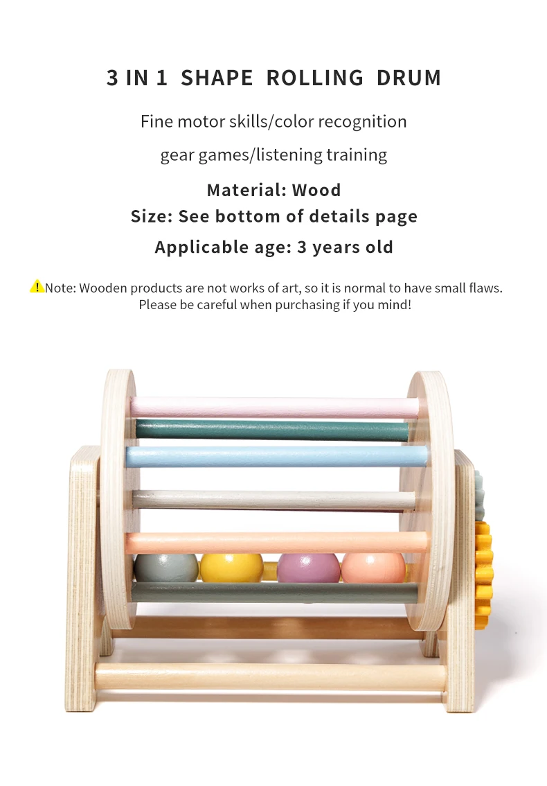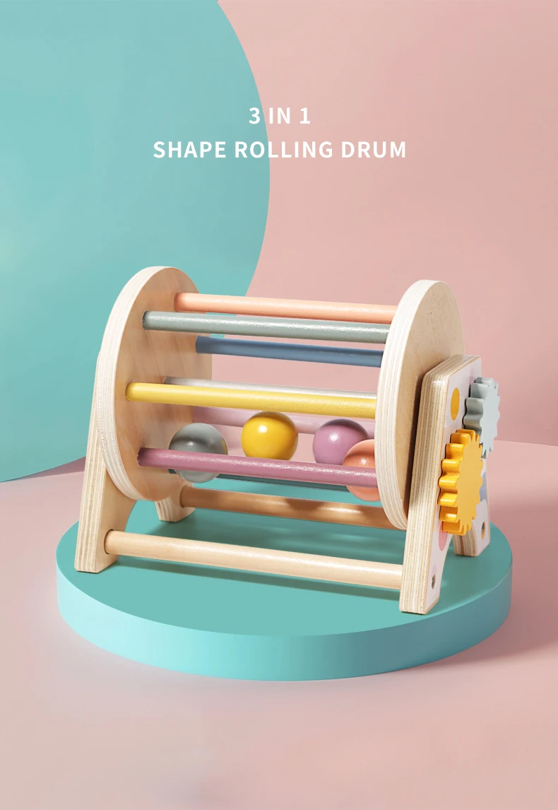 New Style Early Learning Infants Educational Toys Wooden 3 in 1 Montessori Rolling Drum Baby Gear Toys