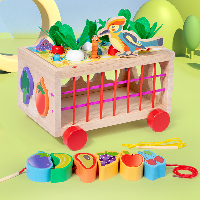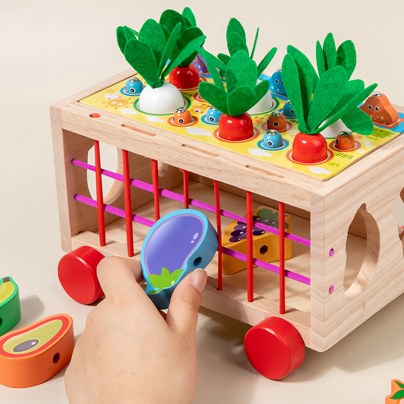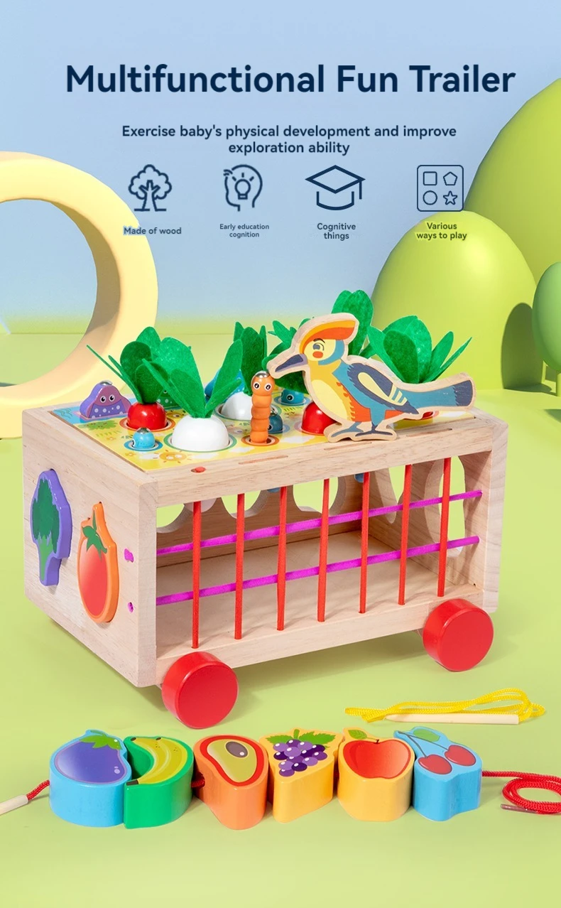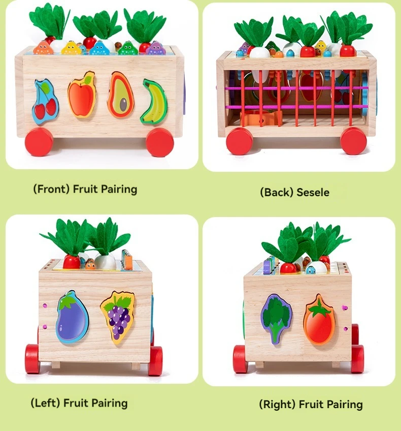 Wooden Pull Car Baby Educational Vegetables Fruits Blocks 7 in 1 Intelligent Car Rope & Column Trailer Educational Toys